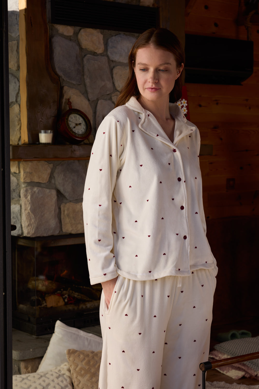 Cream Heart-Pattern Pajama Set with Buttoned Neckline | 6022