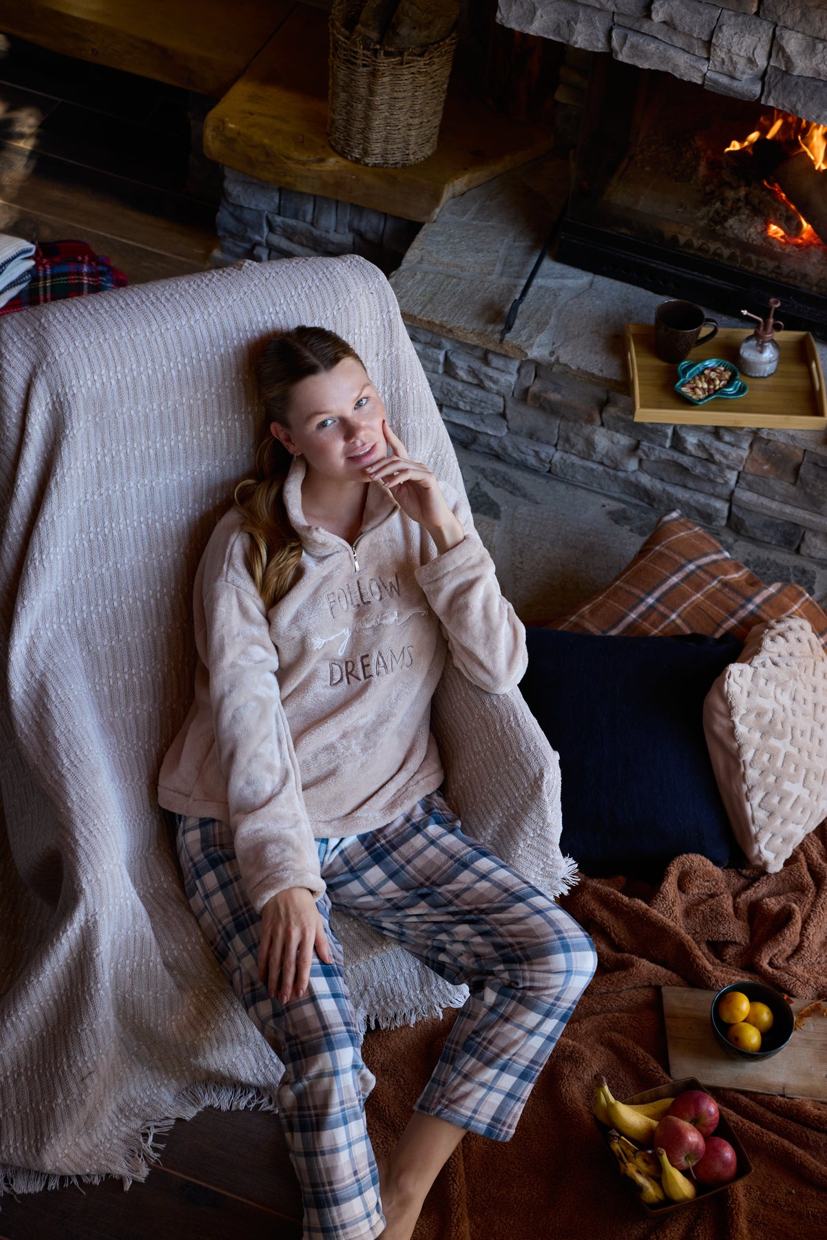 Stay extra warm with this beige fluffy half-zip pajama set , made from ultra-soft winter fleece for maximum comfort.