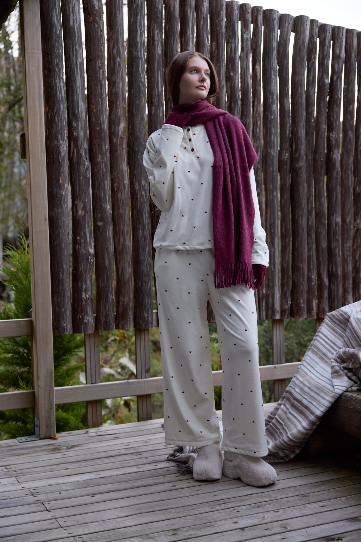 Soft cream pajama set with tiny burgundy heart patterns, a cute buttoned henley neckline, and wide-leg matching pants. Cozy, feminine, and perfect for winter nights.